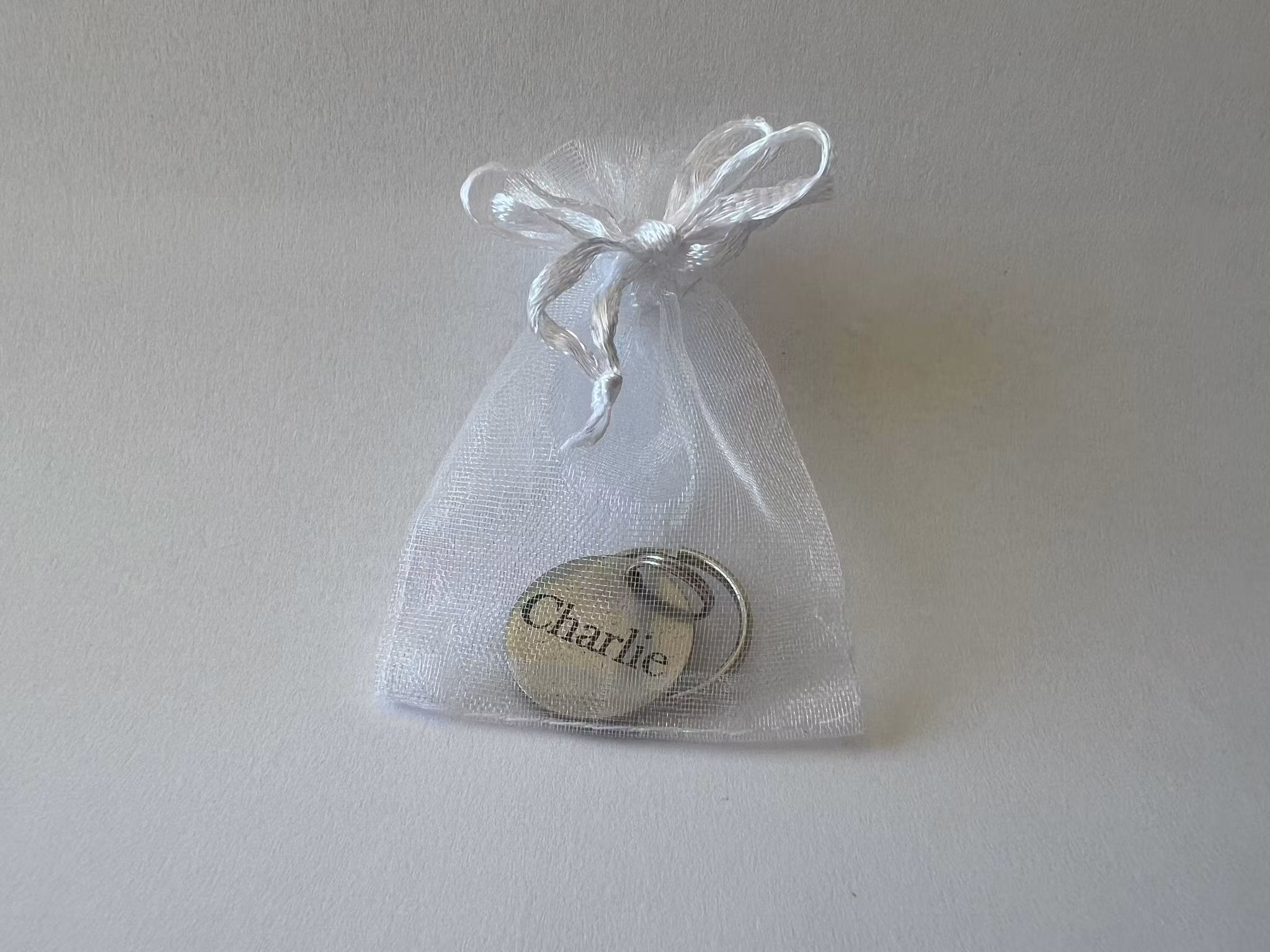 Två olika ringar följer med för att du enkelt ska kunna fästa brickan på önskat sätt i halsbandet.